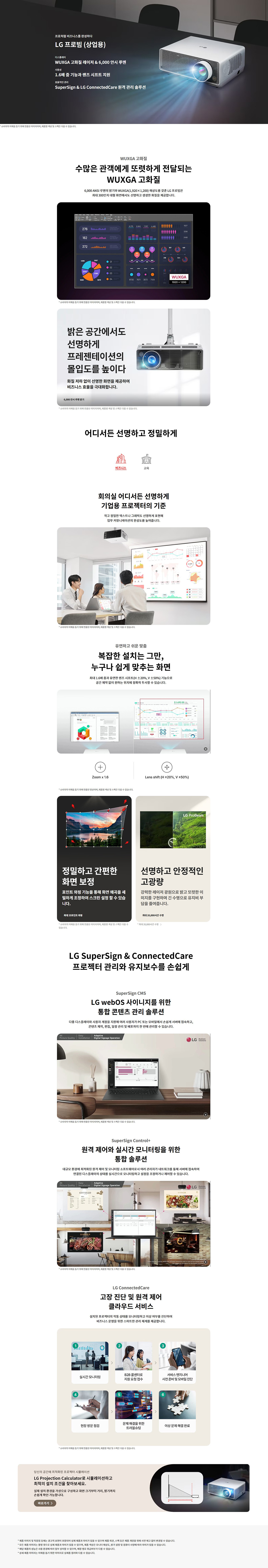 WUXGA 고화질 레이저 & 6,000 안시 루멘1.6배 줌 기능과 렌즈 시프트 지원SuperSign & LG ConnectedCare 원격 관리 솔루션